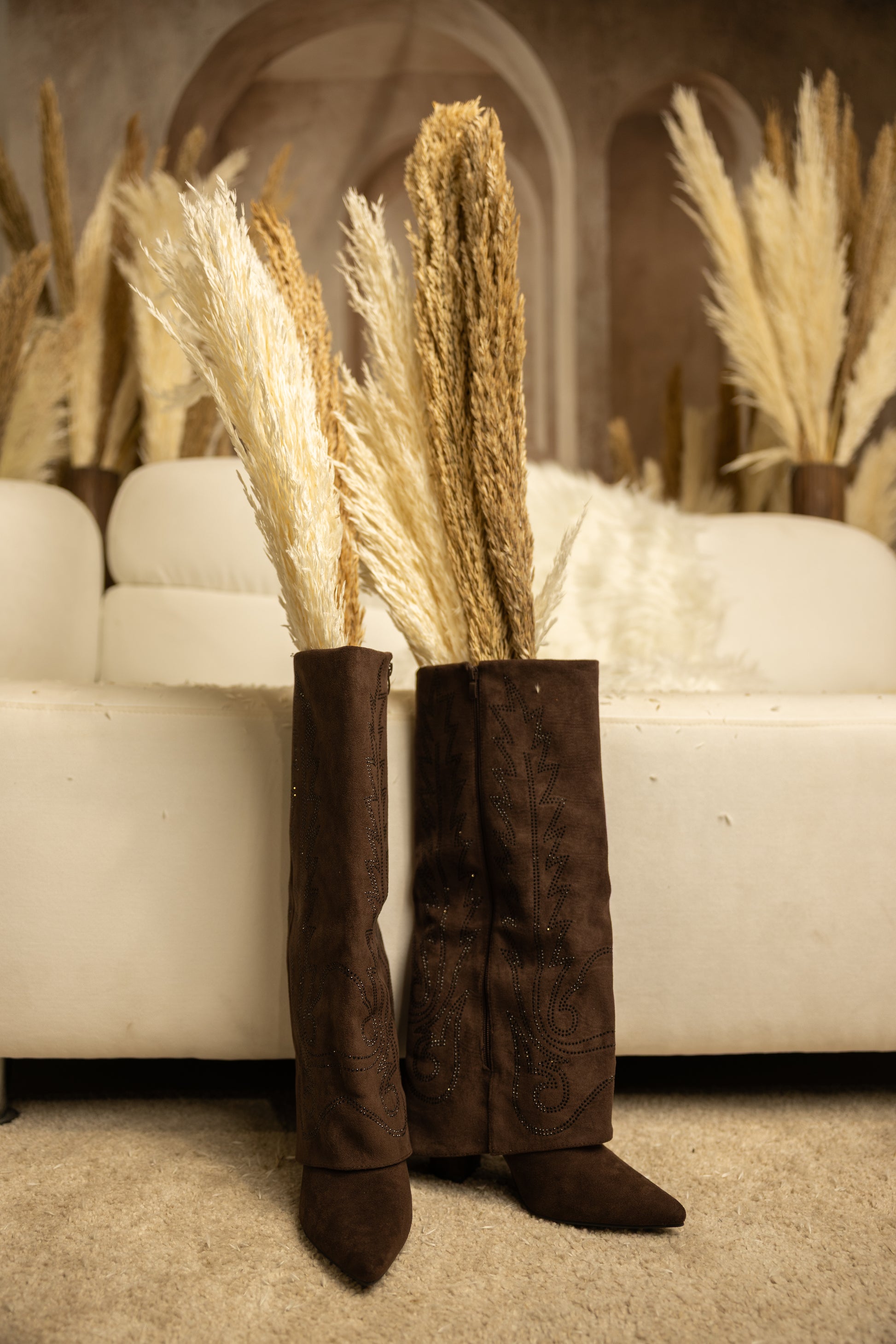 Bota de cano alto em suede castanho, com aplicações de tachas em desenhos western que elevam o clássico cowboy boot a outro nível.