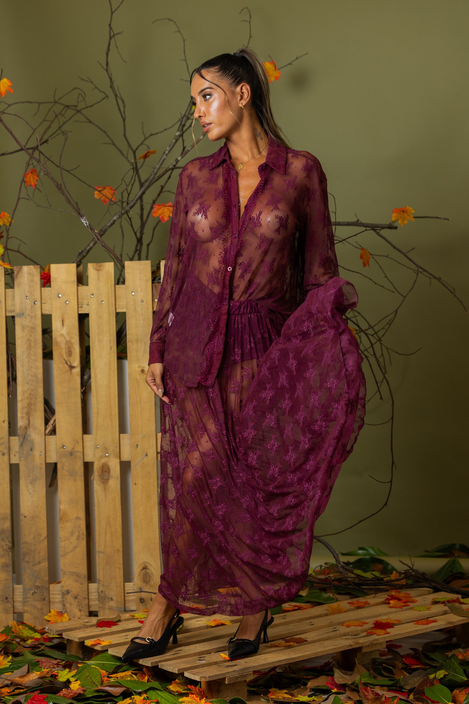 A camisa Blossom é pura elegância e feminilidade. Confeccionada em renda delicada, exibe um padrão floral encantador que acrescenta sofisticação e leveza ao visual. Com botões frontais e um toque translúcido, é perfeita para coordenar com tops, bralettes ou sobreposições.