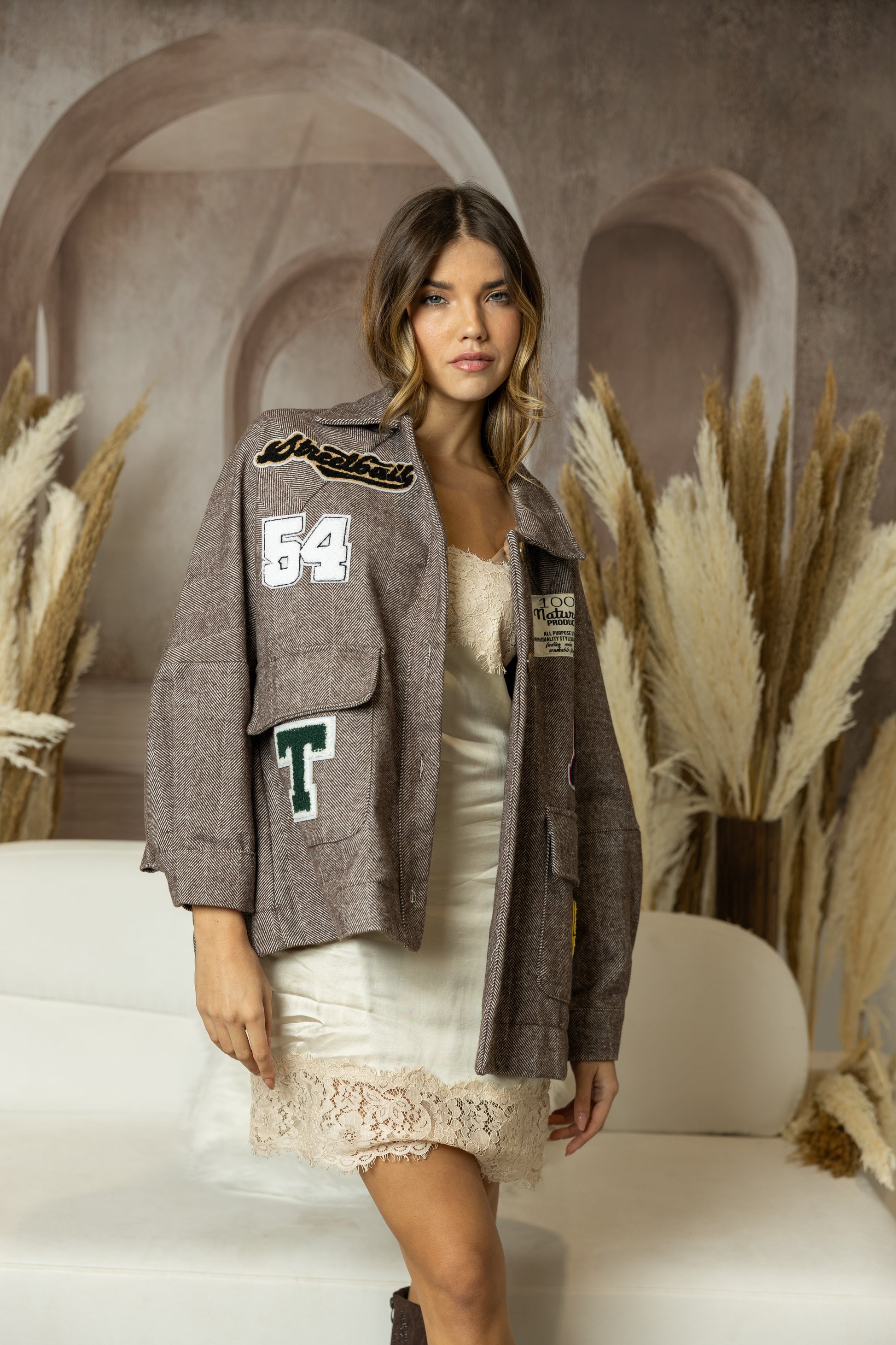 O casaco-camiseiro perfeito para elevar qualquer look casual. Inspirado no estilo college, combina um padrão espinha-de-peixe clássico com aplicações bordadas que dão personalidade e um toque trendy. Modelagem oversized, super confortável e versátil, pode ser usado como camisa ou como casaco leve.