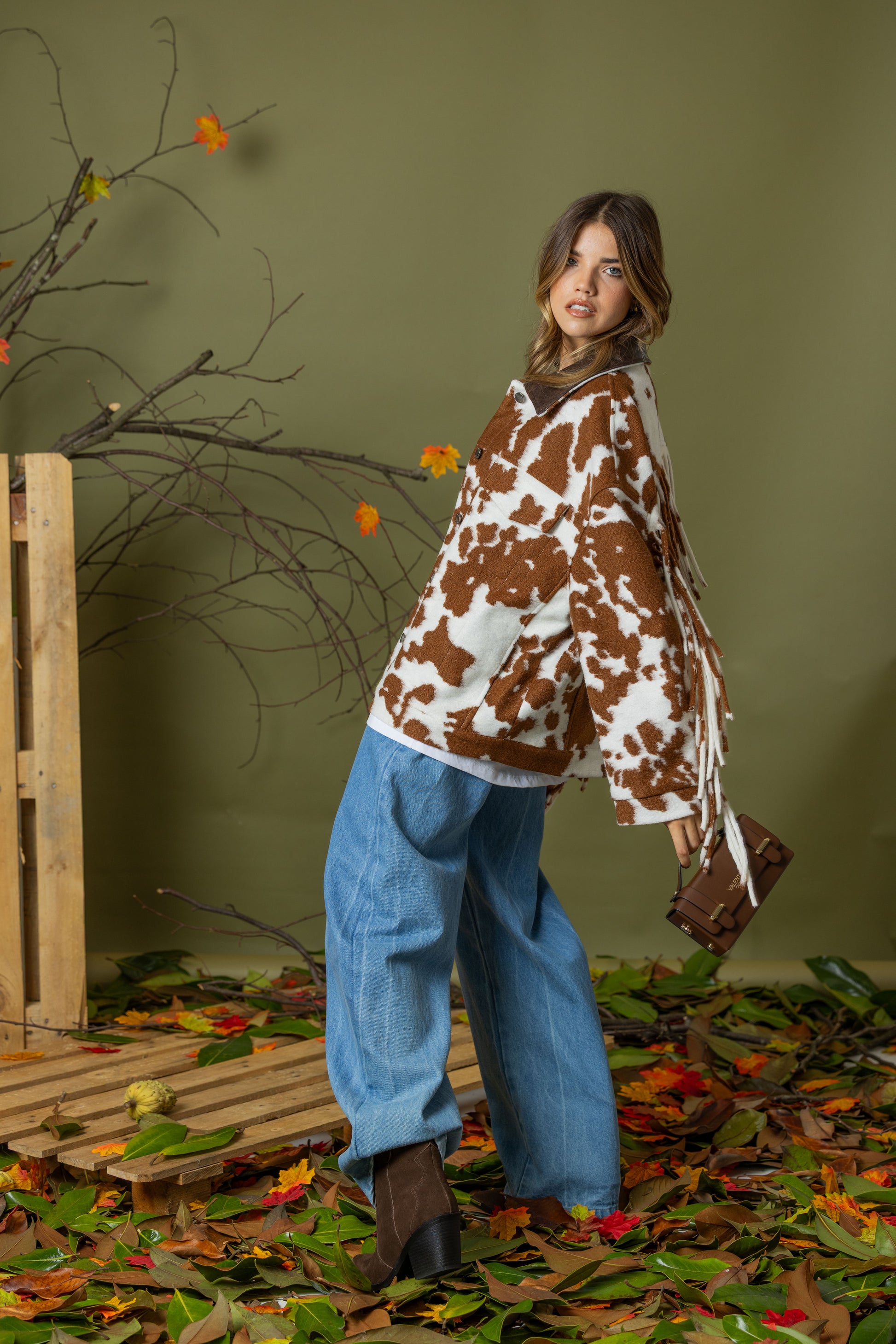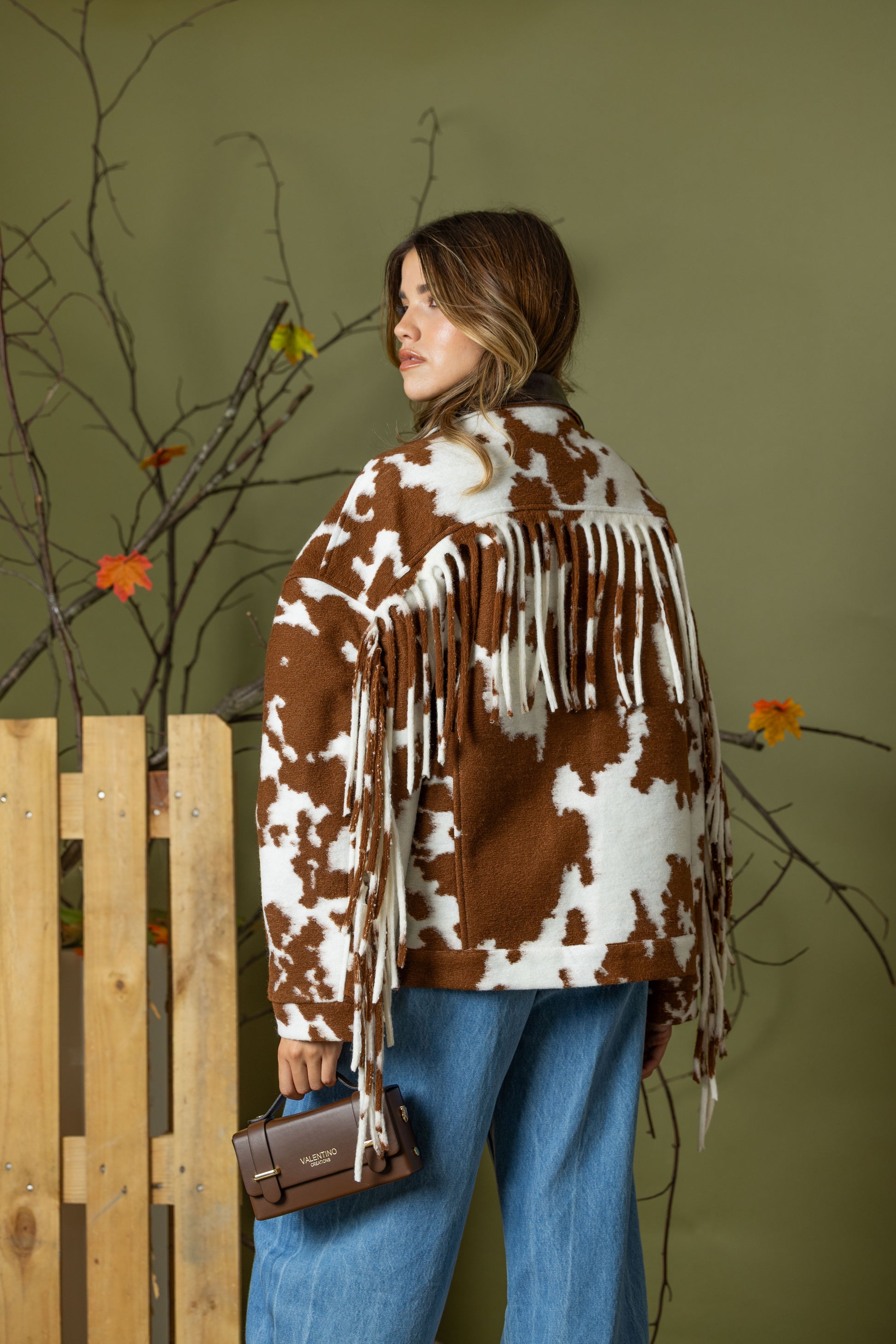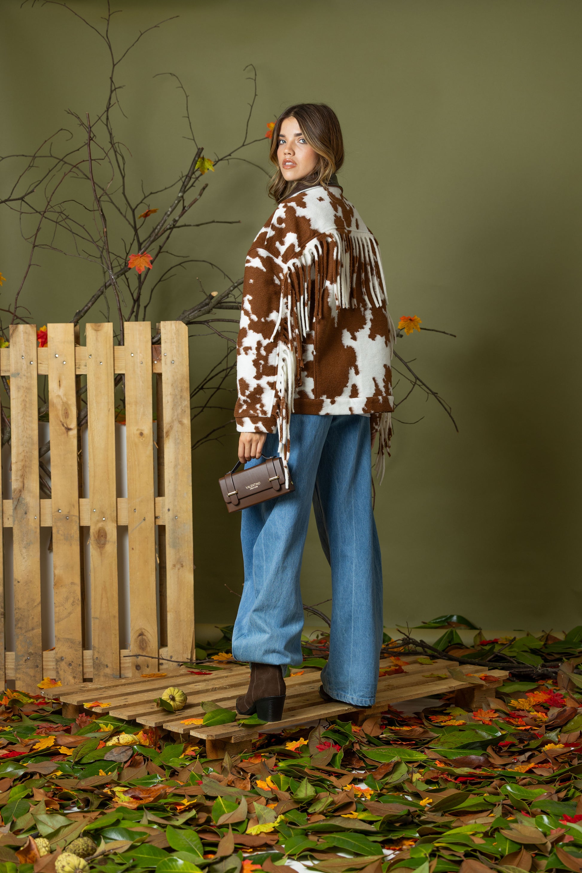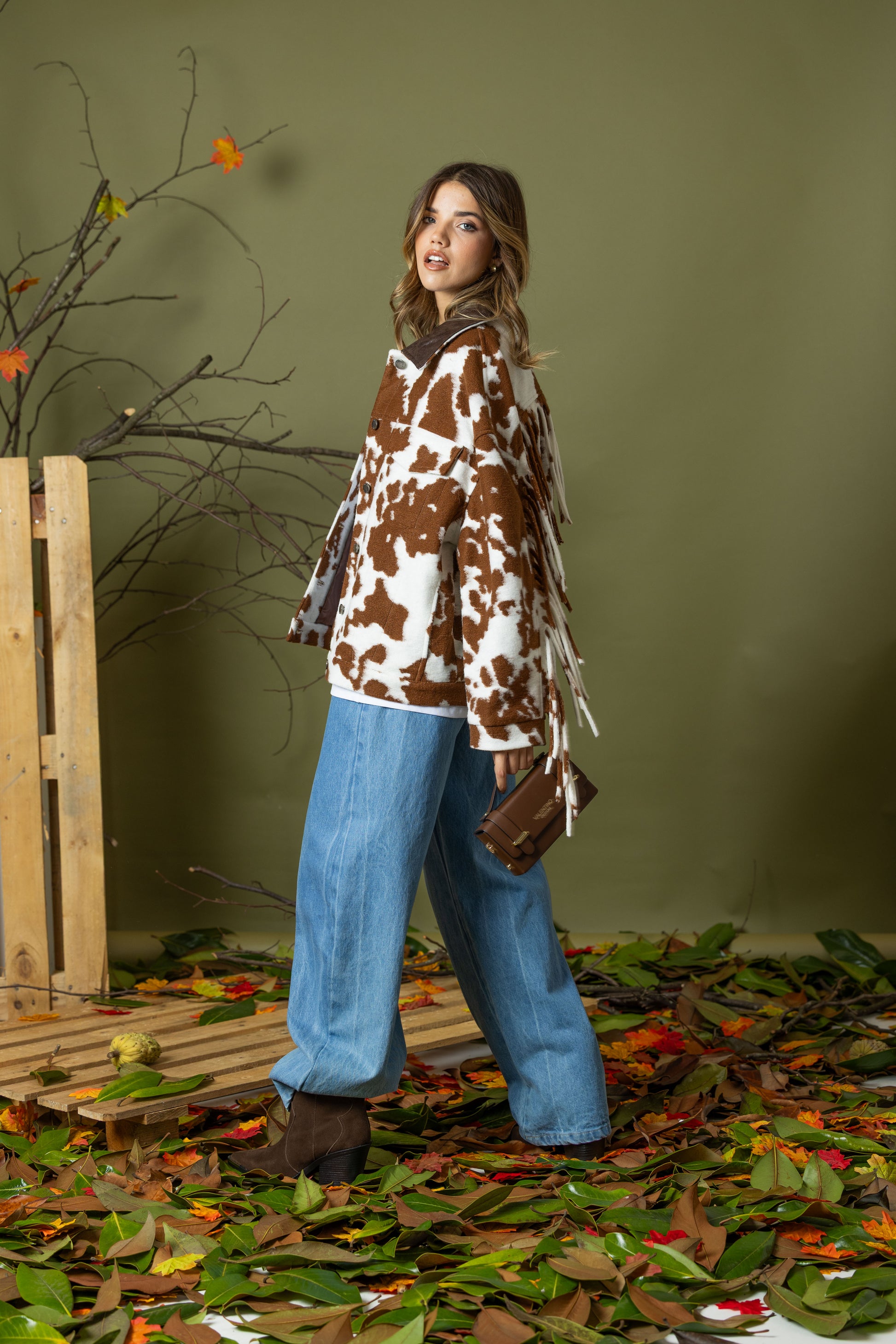 Inspirado no estilo western, este blusão em padrão cow print é a peça tendência que transforma qualquer coordenado. O contraste do colarinho em efeito pele e os detalhes em franjas nas costas trazem movimento e atitude — perfeita para quem gosta de se destacar com estilo.