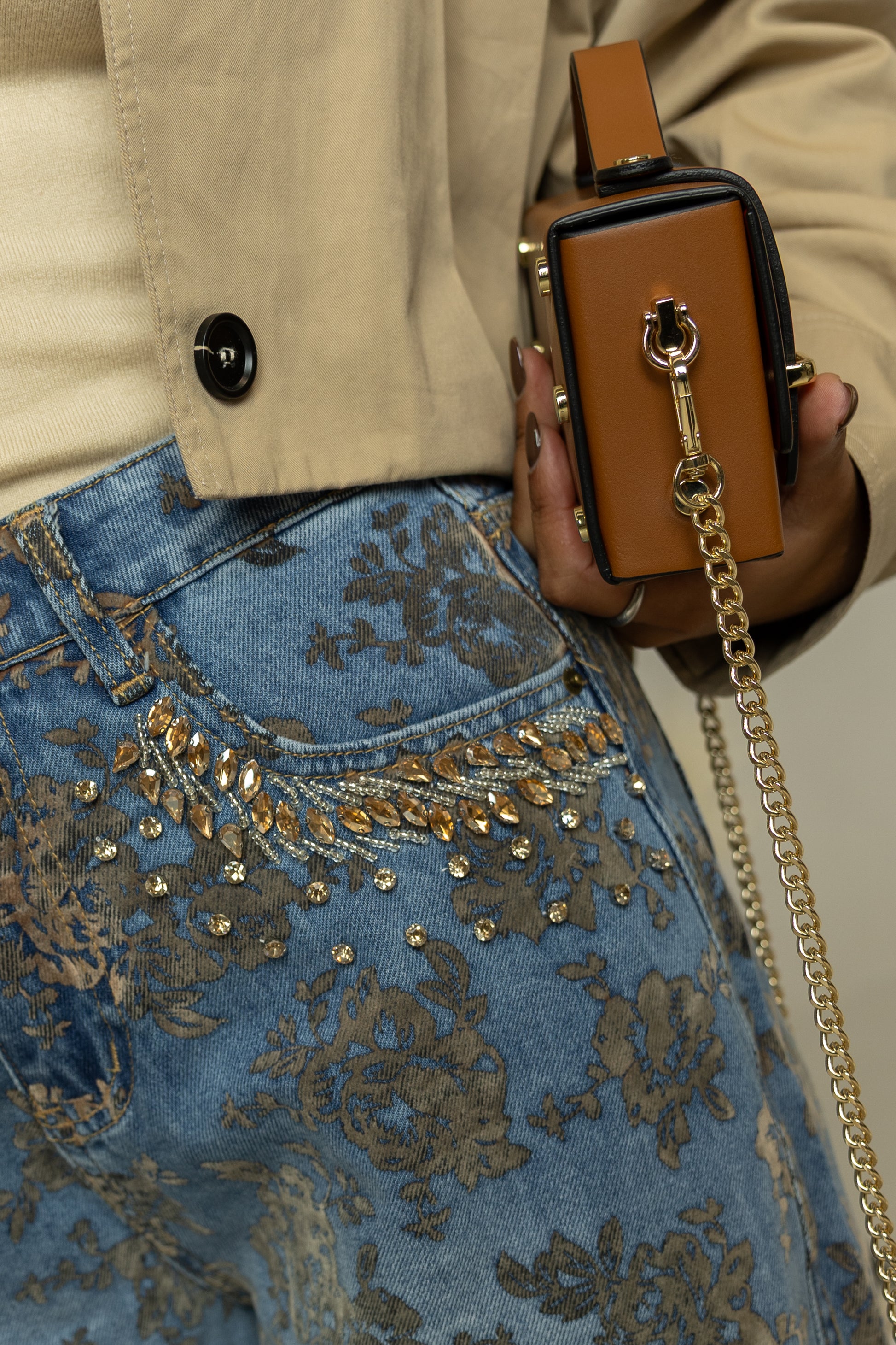 Quando o denim se encontra com a arte, nascem estas Denim Baroque Luxe. Uma peça absolutamente única e cheia de personalidade, com padrão floral em relevo e aplicações brilhantes na zona dos bolsos que elevam qualquer look a um nível de puro glamour.