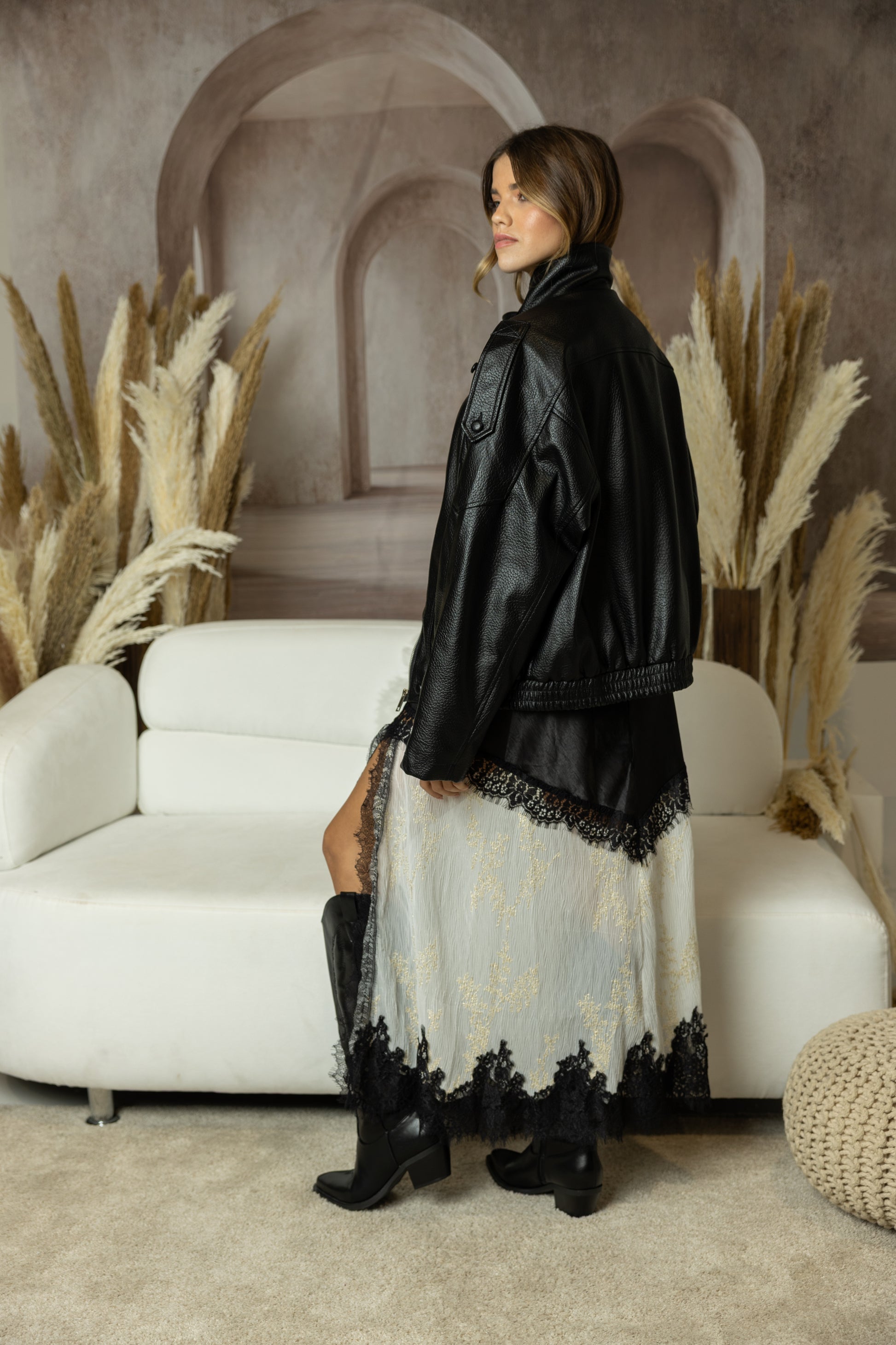 A Saia Duo Luxe Lace é pura elegância contemporânea. Um modelo único que combina sofisticação e textura, juntando o brilho acetinado na parte superior com um tecido drapeado tipo plissado irregular na parte inferior, finalizado com renda delicada e detalhes dourados (na versão preto & branco). Um design que parece saído de editorial, feminino, ousado e extremamente luxuoso.