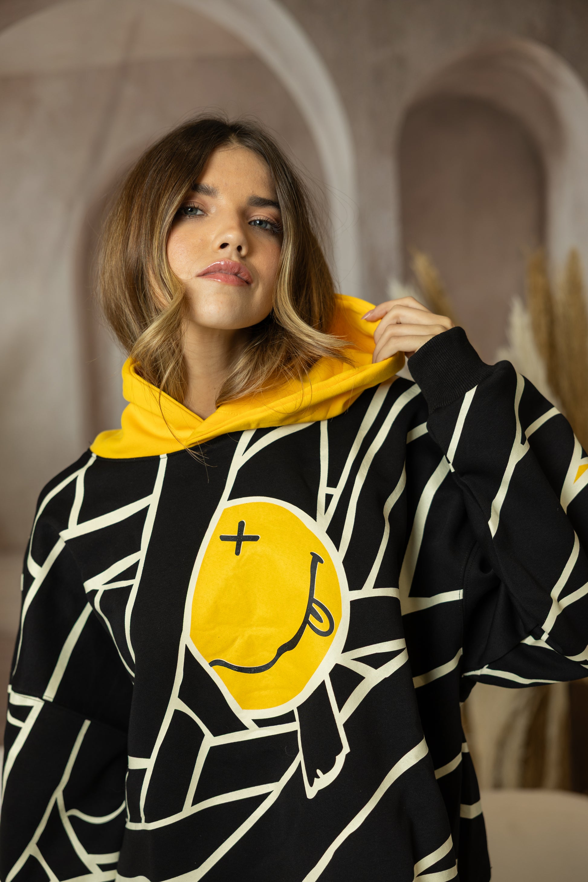 Sweat oversized com capuz contrastante e estampa artística exclusiva. Modelagem ampla, confortável e moderna, veste até XL.