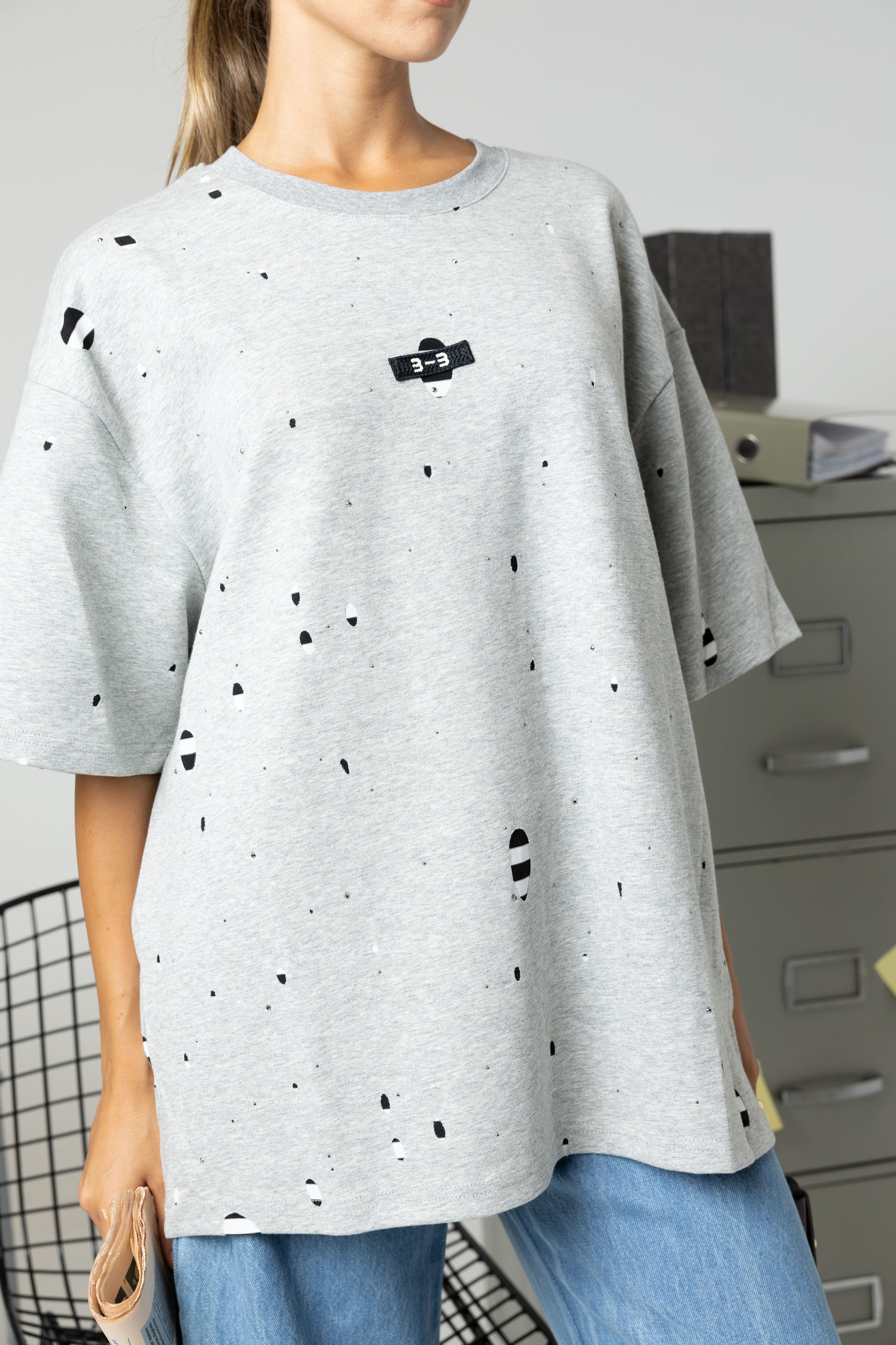 Esta t-shirt única está disponível em duas versões, branca e cinza, ambas com efeito destroyed de aberturas estratégicas que revelam por baixo um tecido às riscas super estiloso.