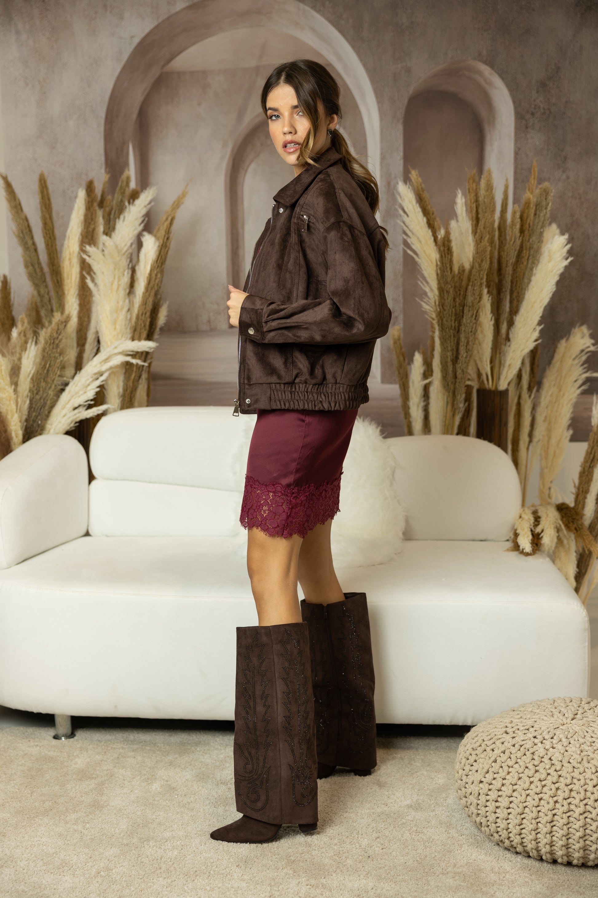 Aposte numa elegância casual com a Velvet Rider Jacket. Inspirada no estilo biker clássico, esta peça vem reinterpretada num tecido tipo camurça ultra macio, que traz sofisticação e conforto ao dia a dia. Os detalhes com fecho metálico, o colarinho estruturado e o acabamento franzido na cintura garantem um fit moderno e feminino, perfeito para elevar qualquer look, do jeans ao slip dress.