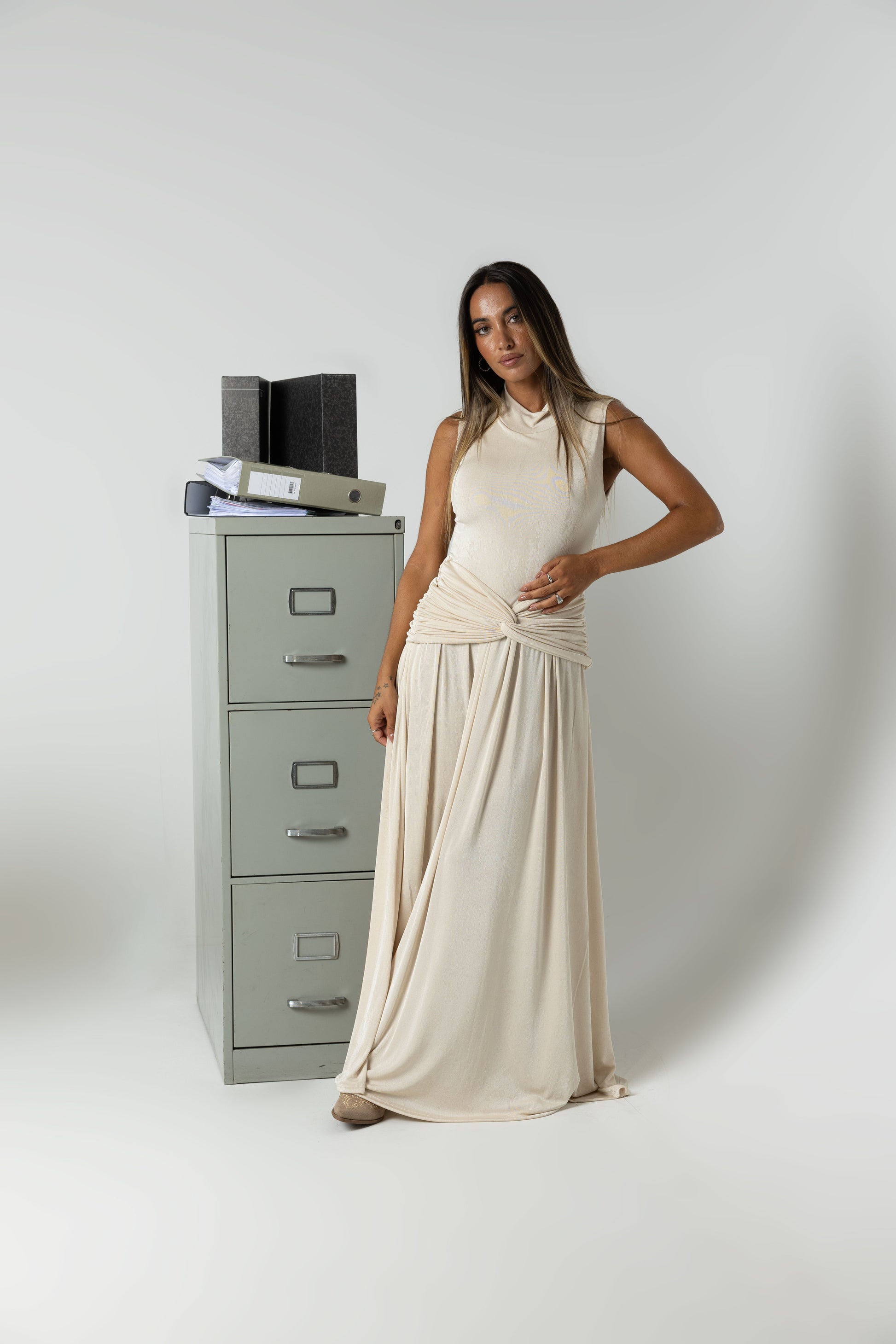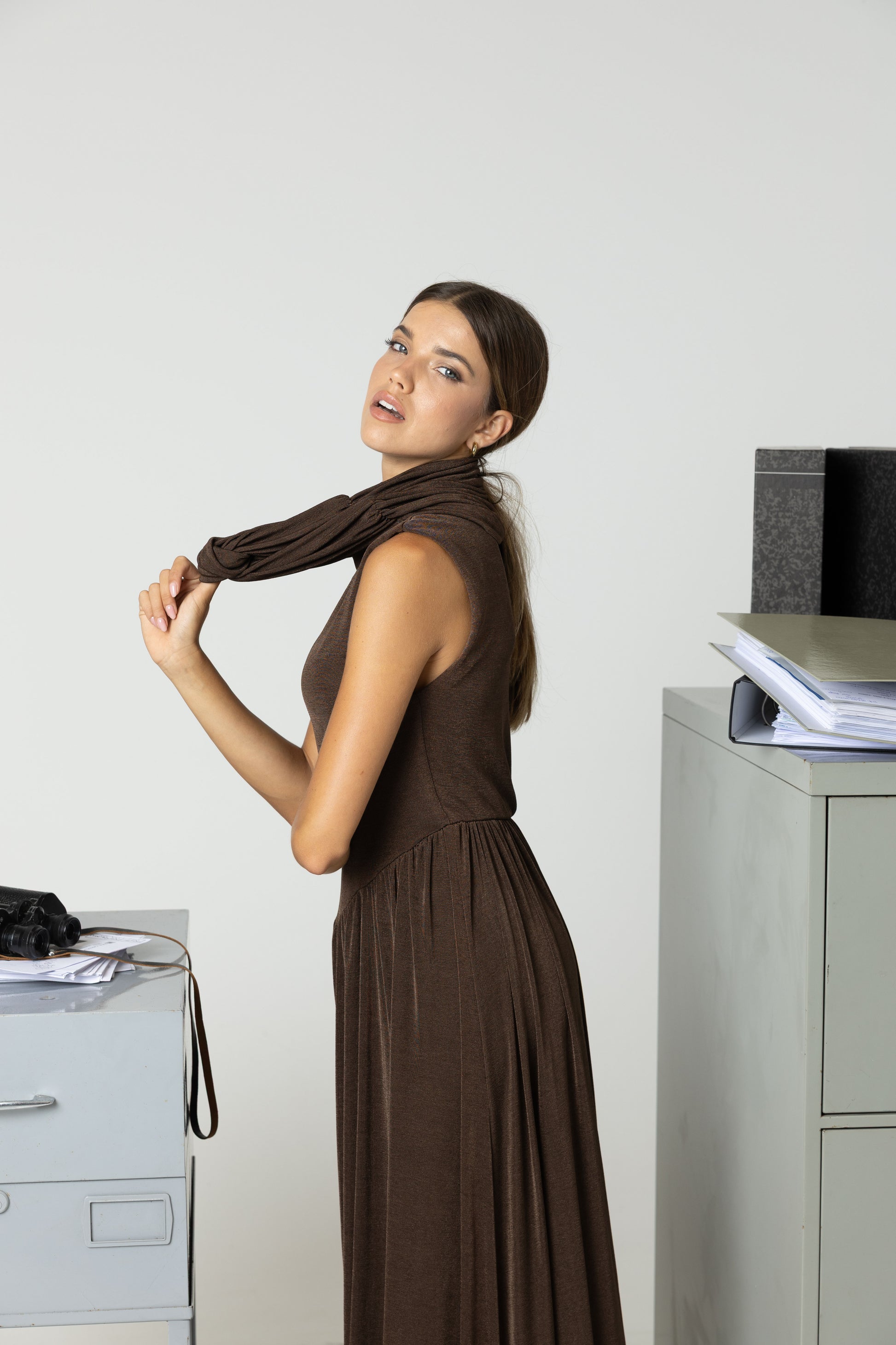 O detalhe da gola drapeada torna este vestido único e versátil, podendo ser usado de várias formas, pois a gola é amovível.